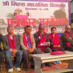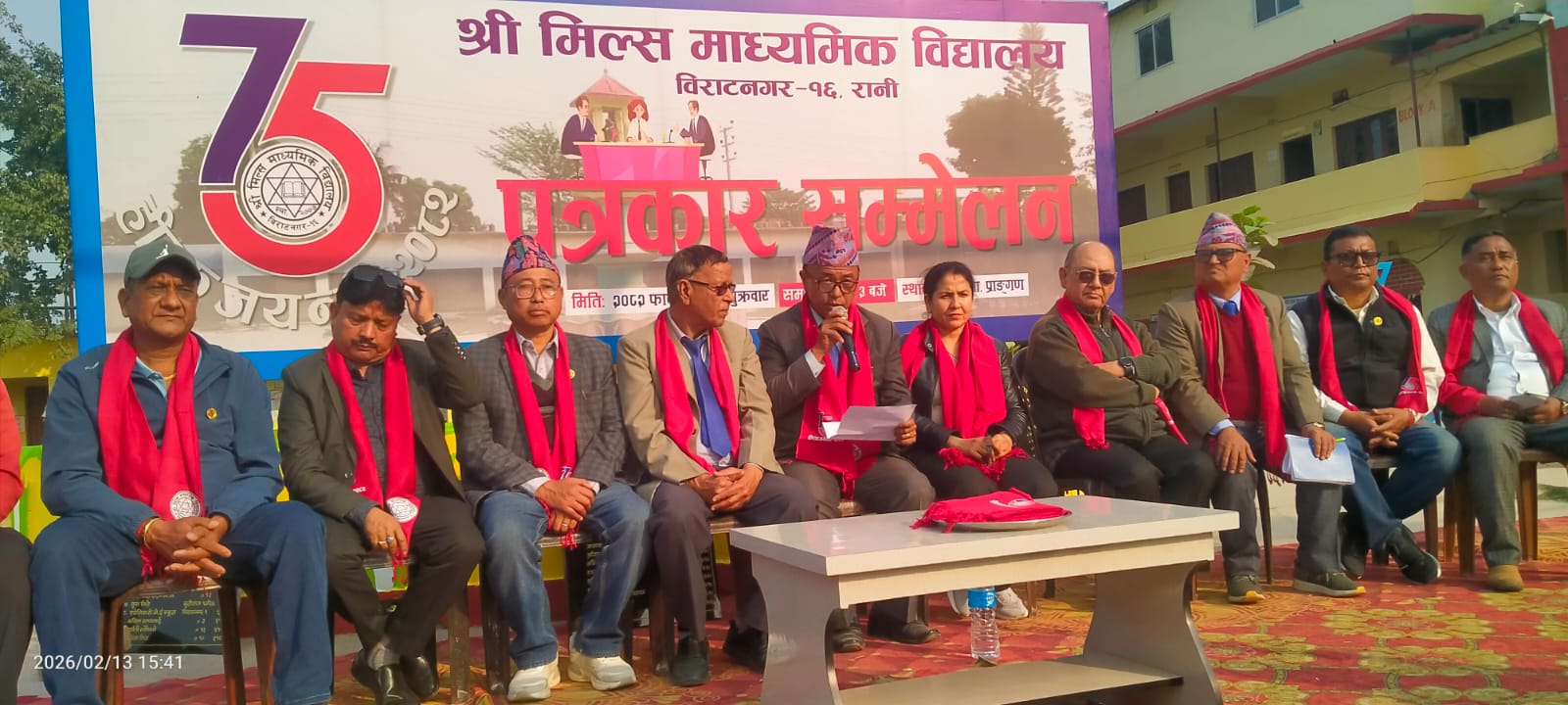 विराटनगर १ फागुन । विराटनगरको मिल्स माध्यमिक विद्यालयले विद्यालय स्थापनाको ७५ औं बार्षिकोत्सव मनाउने भएको छ । फागुन २ देखि ८ गते सम्म विराटनगर १६ मिल्स एरियामा रहेको सो विद्यालयले हीरक जयन्ती मनाउने भएको हो । हीरक जयन्तीका अवसरमा फागुन २ देखि ४ गते सम्म खेलकुद तथा अतिरक्त क्रियाक