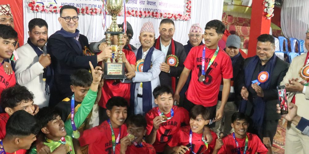 विराटनगर । उच्च शिक्षालय तथा माध्यमिक विद्यालय संघ नेपाल (हिसान) मोरङकोे आयोजनामा हिसान स्पोट्र्स मिट २०८२ अन्तरगत शनिबार राती सम्पन्न भएको हिसान फुटबल अन्तरगत छात्र तथा छात्रातर्फ रेडस्टार कलेजले उपाधि जितेको छ । शहिद मैदानमा भएको छात्रतर्फको फाइनल खेलमो रेडस्टार कलेजले शिक्षा स