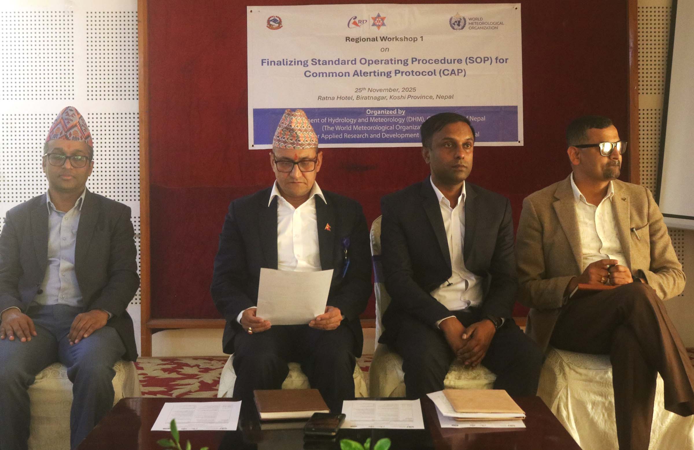 जल तथा मौसम विज्ञान कार्यालय धरानद्वारा आज विराटनगरमा आयोजित साझा चेतावनी प्रोटोकलको मानक सञ्चालन कार्यविधिलाई अन्तिम रूप दिन सुझाव सङ्कलन कार्यक्रमको उद्घाटन गर्दै मोरङका प्रमुख जिल्ला अधिकारी युवराज कट्टेलले जनताले बुझ्ने भाषामा सूचना सम्प्रेषण हुनुपर्ने बताउनु भयो ।