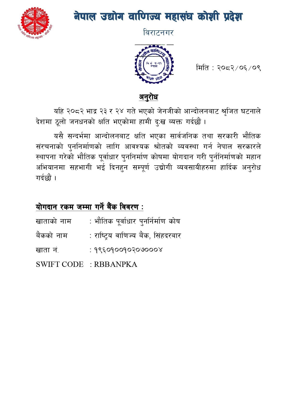 विस्तारमाविराटनगर ९ असोज । नेपाल उद्योग बाणिज्य महासंघ कोशी प्रदेशले नेपाल सरकारले स्थापना गरेको भौतिक पूर्वाधार पुननिर्माण कोषमा योगदान गरी