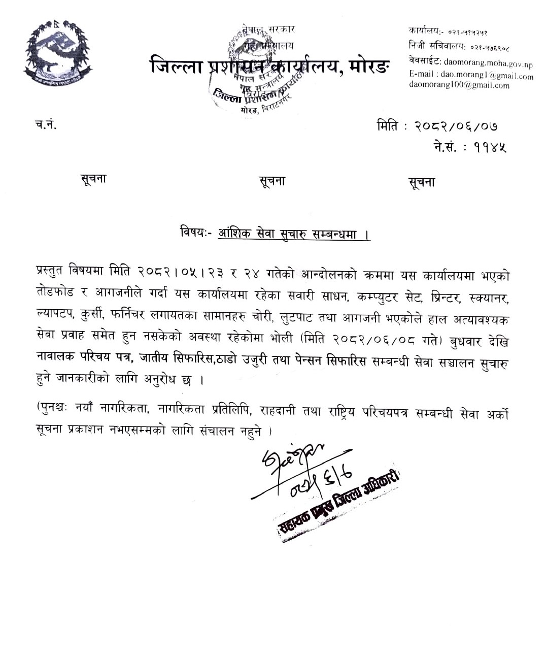 विस्तारमाविराटनगर, ७ असोज ः जिल्ला प्रशासन कार्यालय मोरङले भोलिदेखि आंशिक सेवा शुरु गर्ने जनाएको छ। जेनजीको आन्दोलनका क्रममा भएको